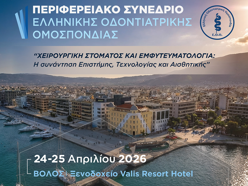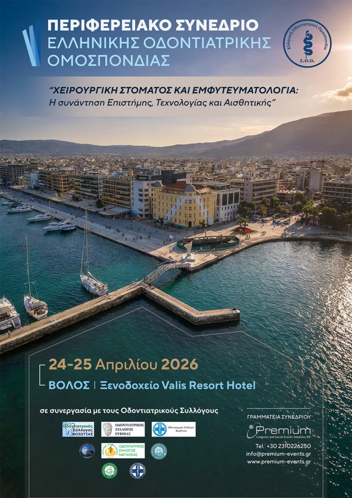 Η πρώτη περιφερειακή Σύνοδος θα πραγματοποιηθεί στον Βόλο στις 24-25 Απριλίου 2026 στο ξενοδοχείο “Valis Resport” με κεντρικό θέμα “Χειρουργική Στόματος και Εμφυτευματολογία: Η συνάντηση Επιστήμης, Τεχνολογίας και Αισθητικής”.