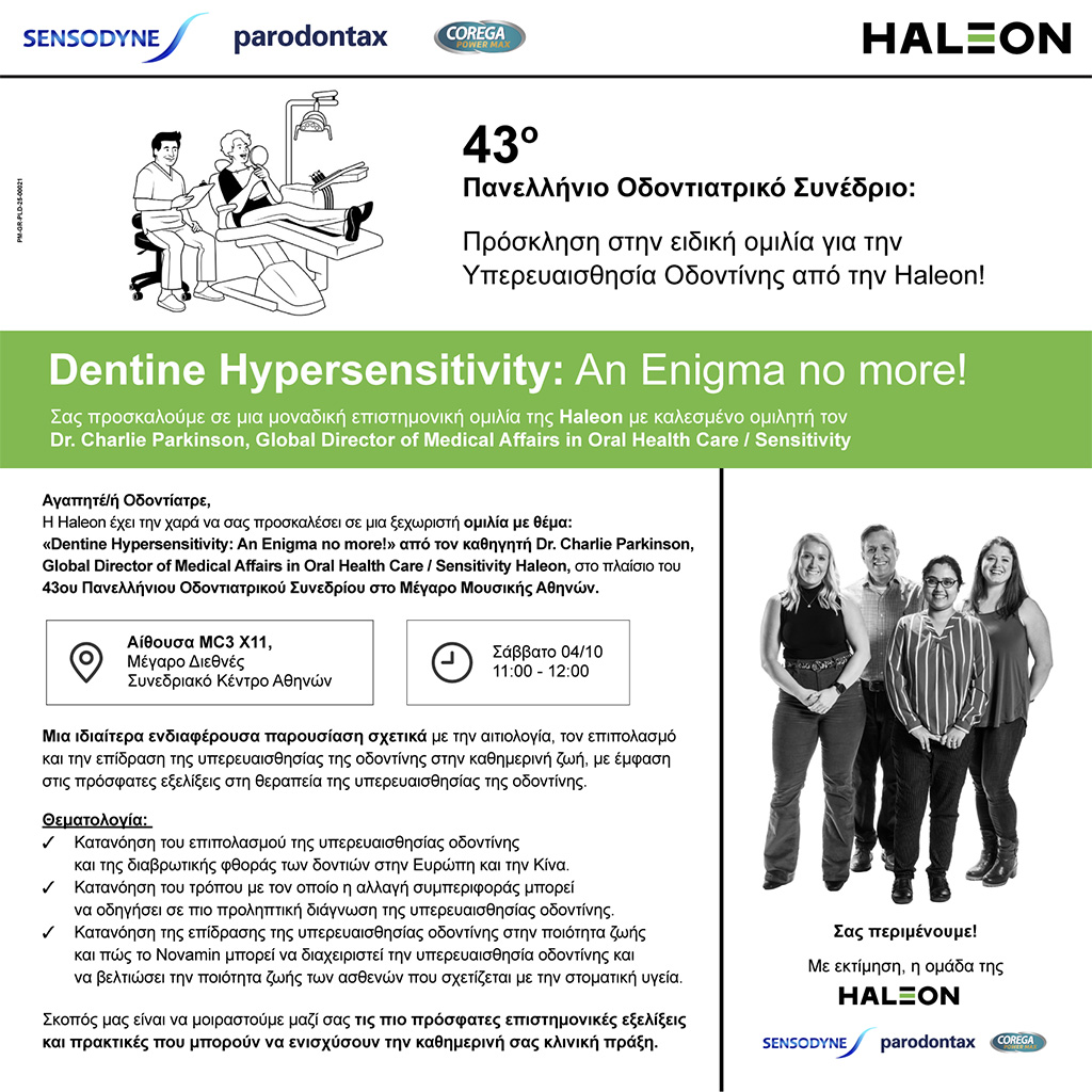 Η Haleon έχει τη χαρά να σας προσκαλέσει το Σάββατο 4 Οκτωβρίου, σε μια ξεχωριστή ομιλία με θέμα: «Dentine Hypersensitivity: An Enigma no more!» από τον καθηγητή Dr. Charlie Parkinson, στο πλαίσιο του 43ου Πανελλήνιου Οδοντιατρικού Συνεδρίου στο Μέγαρο Μουσικής Αθηνών, Αίθουσα MC3 X11.