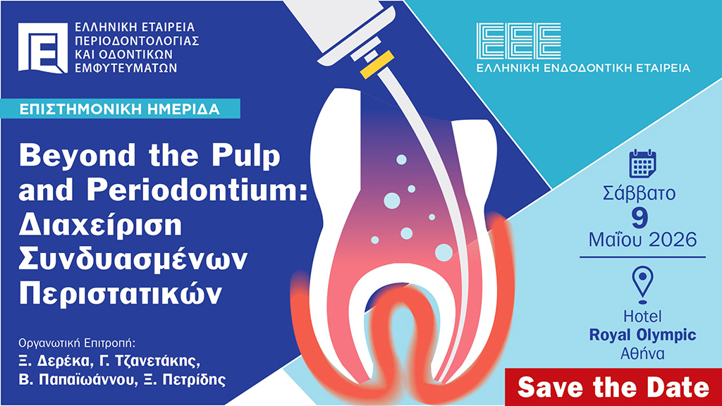 Το νέο έτος ξεκινά με τη διοργάνωση Ημερίδας σε συνεργασία με την Ελληνική Ενδοδοντική Εταιρεία με θέμα «Beyond the Pulp and Periodontium: Διαχείριση Συνδυασμένων Περιστατικών», η οποία θα πραγματοποιηθεί στις 9 Μαΐου 2026, στο Ξενοδοχείο «Royal Olympic», στην Αθήνα. Θα αποτελέσει σημείο συνάντησης γνώσης, εμπειρίας και σύγχρονων θεραπευτικών προσεγγίσεων ενδοδοντίας και περιοδοντολογίας. Μέσα από στοχευμένες ομιλίες και κλινικά παραδείγματα, θα αναδειχτεί η στενή διασύνδεση των δύο ειδικοτήτων και η σημασία της διεπιστημονικής συνεργασίας για την ολοκληρωμένη αντιμετώπιση σύνθετων οδοντιατρικών περιστατικών.