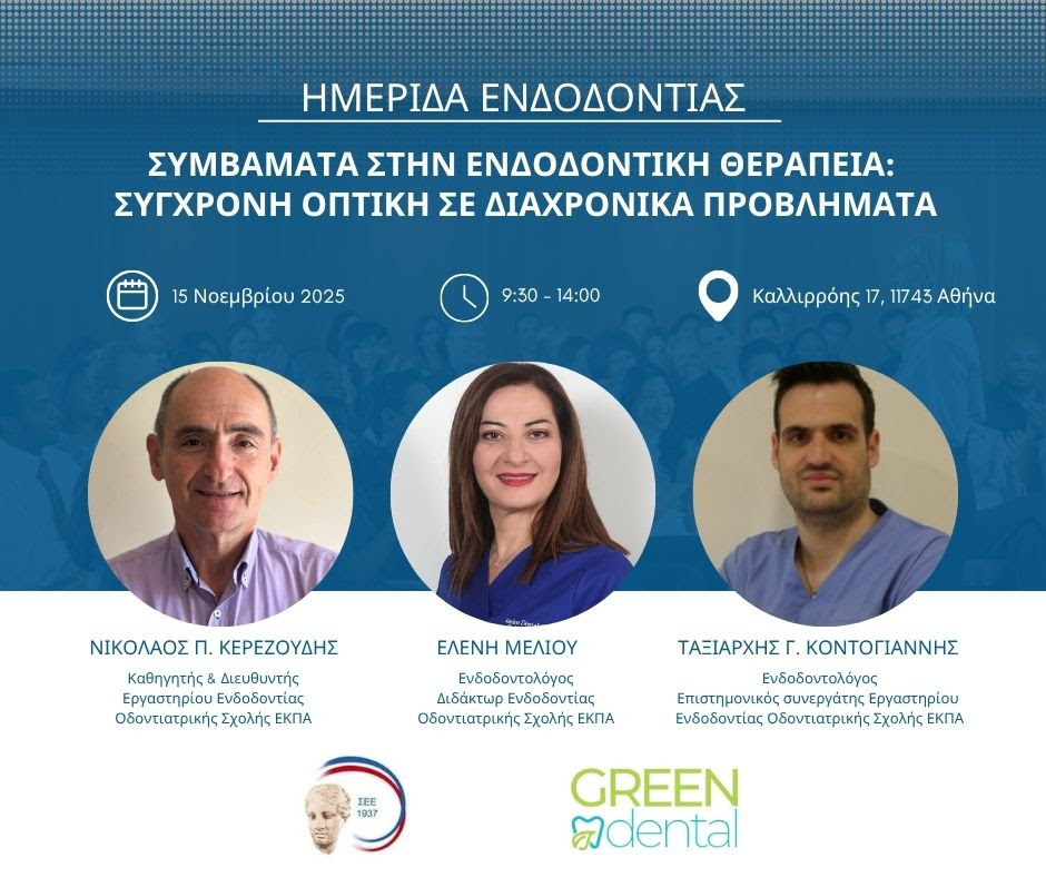 H Στοματολογική Εταιρεία της Ελλάδος διοργανώνει το Σάββατο 15 Νοεμβρίου 2025 ημερίδα με θέμα «Συμβάματα στην ενδοδοντική θεραπεία: σύγχρονη οπτική σε διαχρονικά προβλήματα» στο πλαίσιο της οποίας θα παρουσιαστούν περιστατικά-πρόκληση!