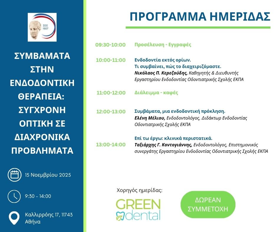 Η συμμετοχή στην ημερίδα είναι δωρεάν, προσφορά της εταιρείας Green Dental!