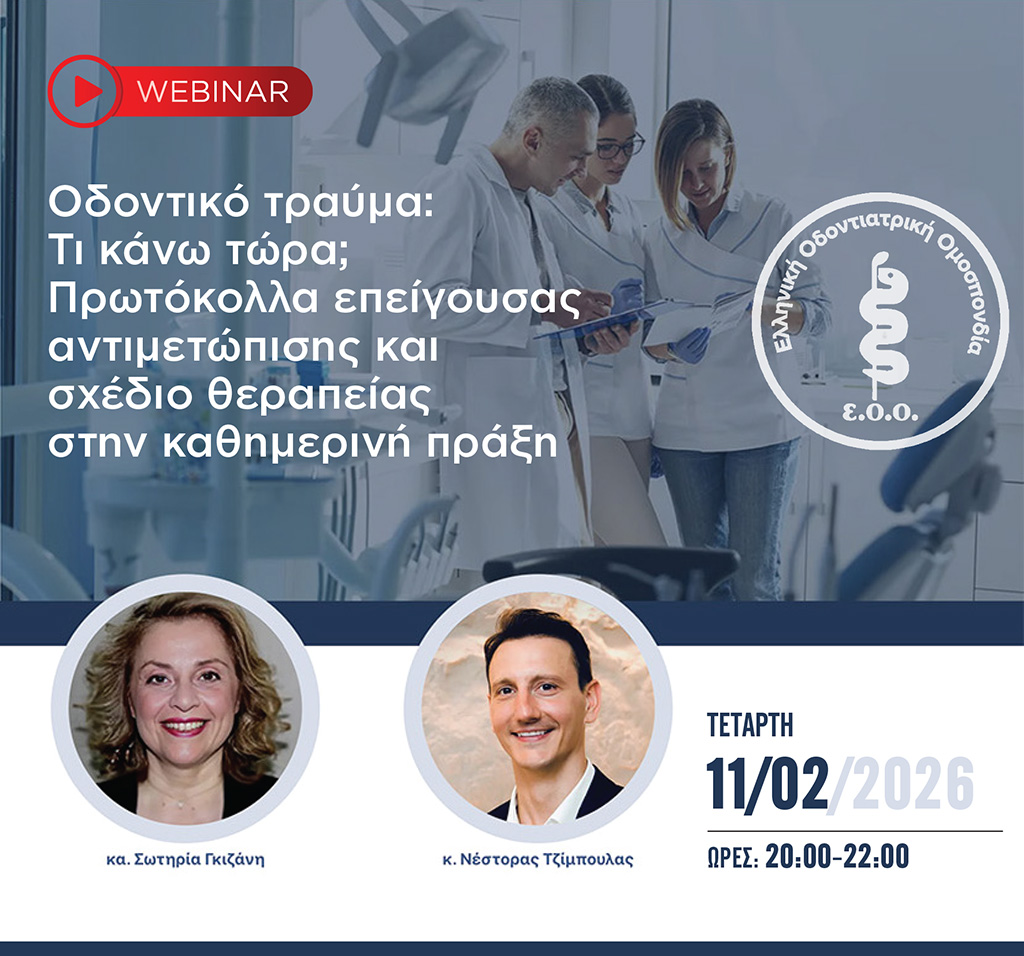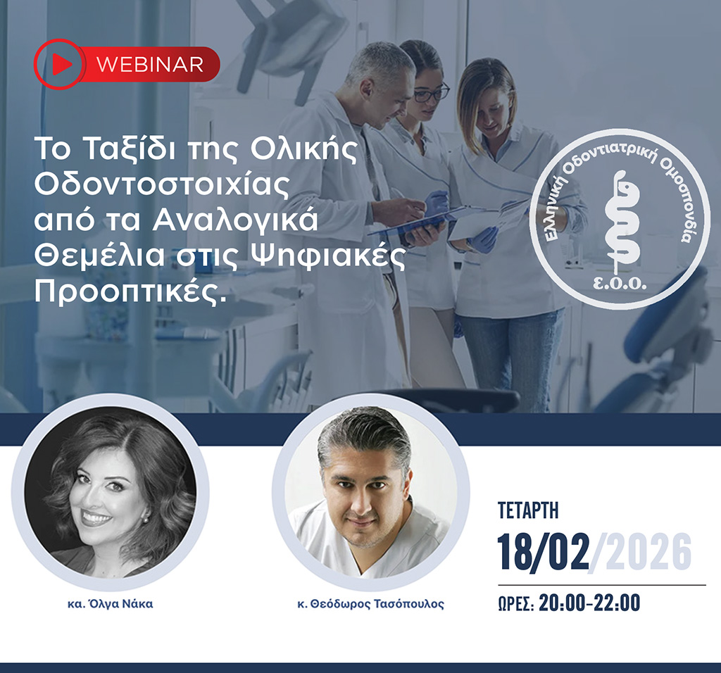 Στο πλαίσιο της έμπρακτης δέσμευσης της Ελληνικής Οδοντιατρικής Ομοσπονδίας (ΕΟΟ) να λειτουργεί ως ουσιαστικός μοχλός αναβάθμισης του οδοντιατρικού επαγγέλματος, εντάσσεται η πρωτοβουλία υλοποίησης πέντε εκπαιδευτικών webinars υπό την ευθύνη της ΕΟΟ. Η δράση αυτή εστιάζει στη σύγχρονη κλινική πρακτική, στις τεχνολογικές εξελίξεις και στις νέες τάσεις του κλάδου. Το πρώτο webinar της σειράς θα πραγματοποιηθεί […]