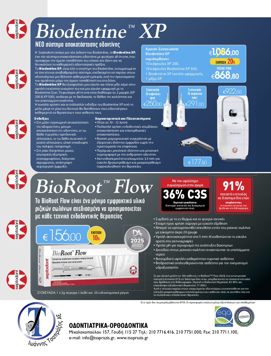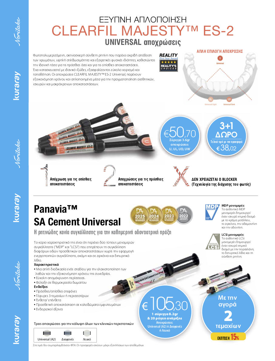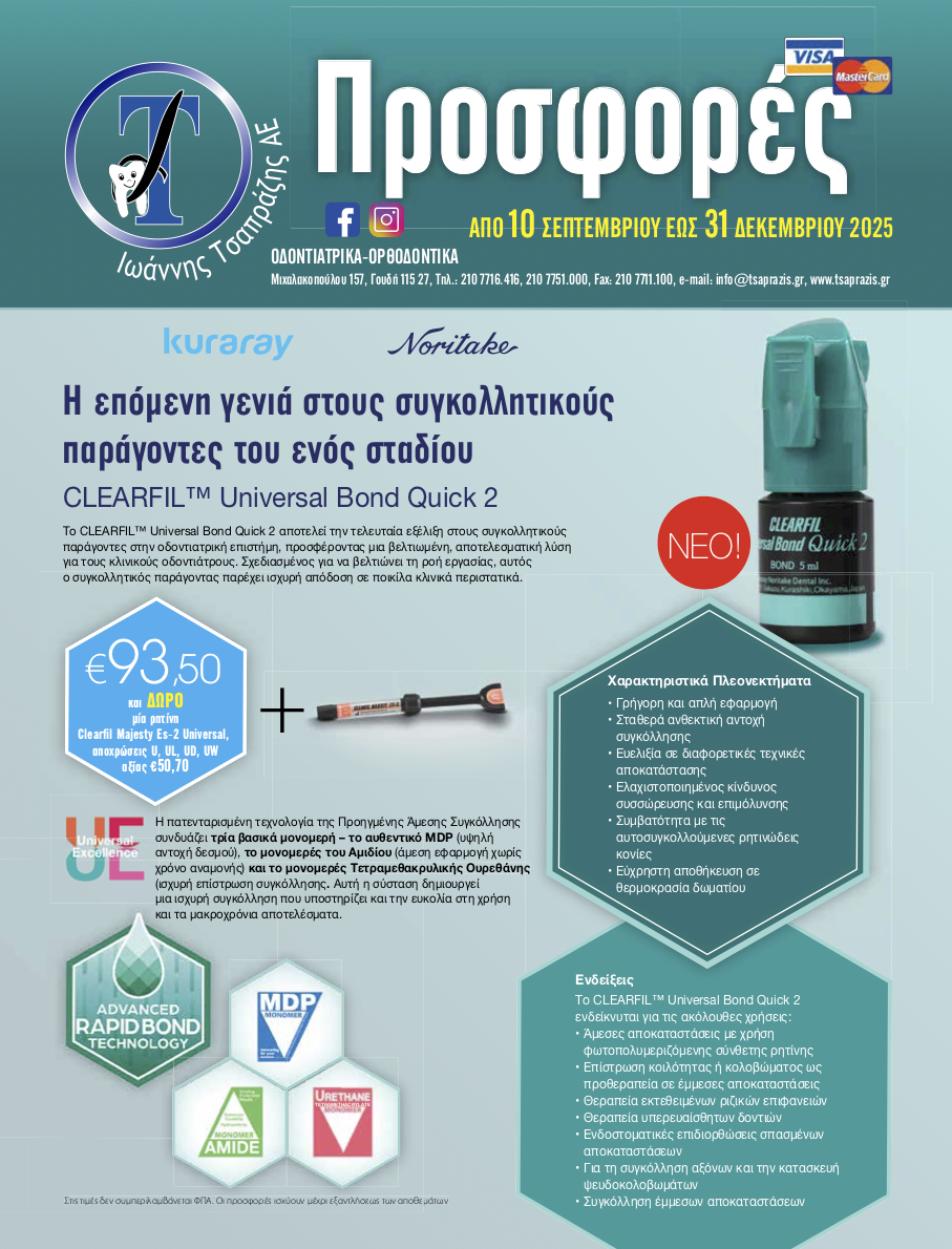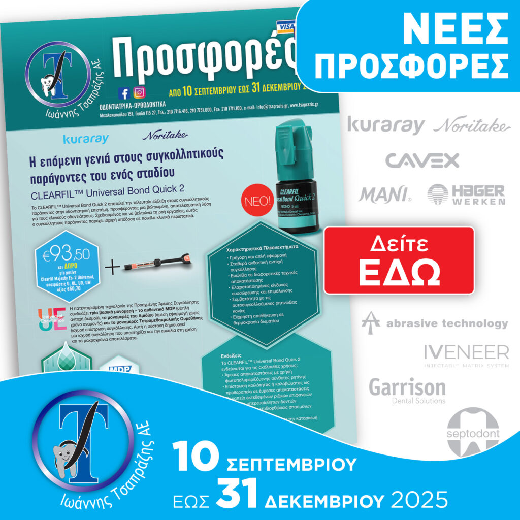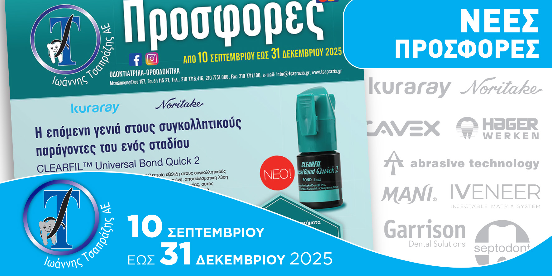 Η εταιρεία Ιωάννης Τσαπράζης Α.Ε. υποδέχεται τη νέα επαγγελματική σεζόν με ειδικές προσφορές που ισχύουν από τις 10 Σεπτεμβρίου έως και τις 31 Δεκεμβρίου 2025. Οι προσφορές αφορούν επιλεγμένα οδοντιατρικά είδη από κορυφαίους κατασκευαστές, όπως: Kuraray Noritake, Garrison Dental Solutions, Cavex, Hager & Werken, Mani και Septodont.