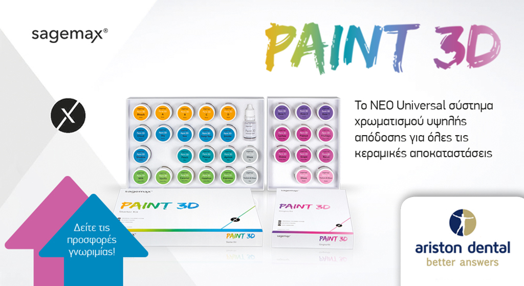 H Ariston Dental σας δίνει τη δυνατότητα να γνωρίσετε το νέο σύστημα χρωματισμού PAINT 3D σε ΜΟΝΑΔΙΚΕΣ ΤΙΜΕΣ ΕΥΚΑΙΡΙΑΣ!