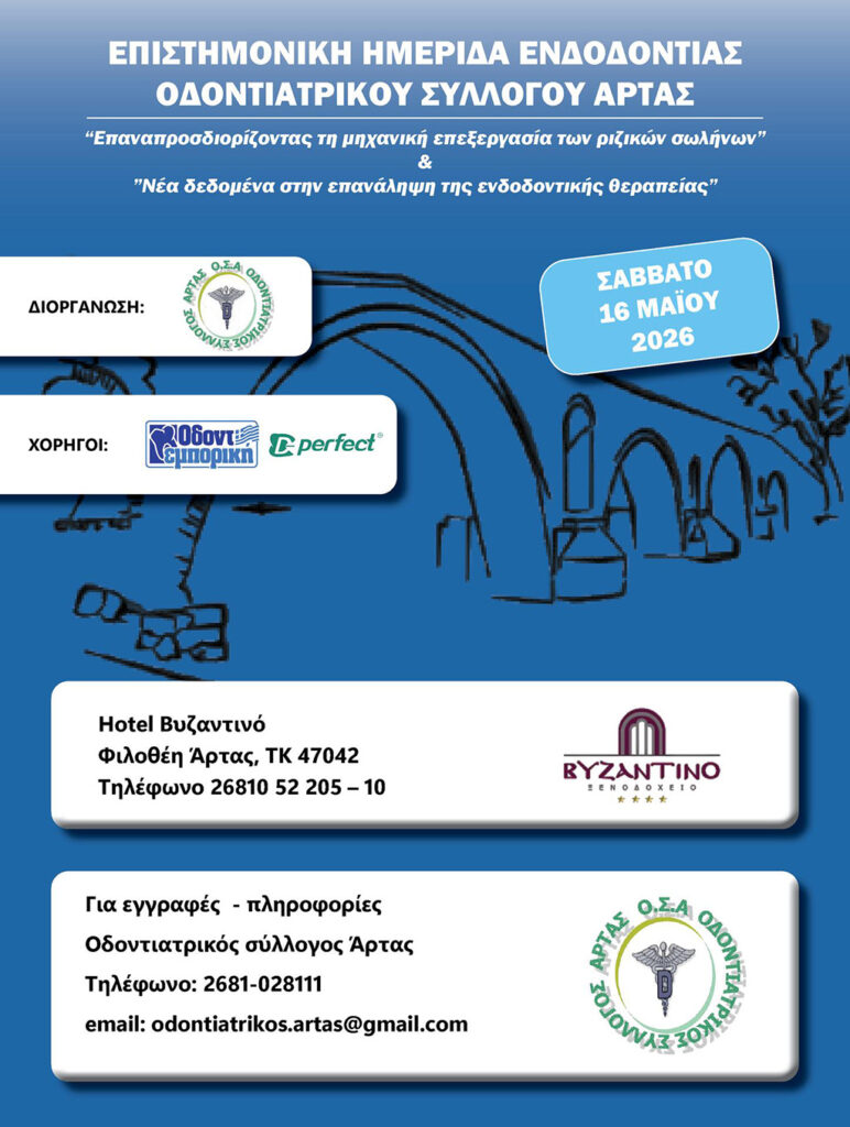 Ο Οδοντιατρικός Σύλλογος Άρτας διοργανώνει μια επιστημονική ημερίδα ενδοδοντίας με θέμα: «Επαναπροσδιορίζοντας τη μηχανική επεξεργασία των ριζικών σωλήνων» & «Νέα δεδομένα στην επανάληψη της ενδοδοντικής θεραπείας» 📅 Σάββατο 16 Μαΐου […]