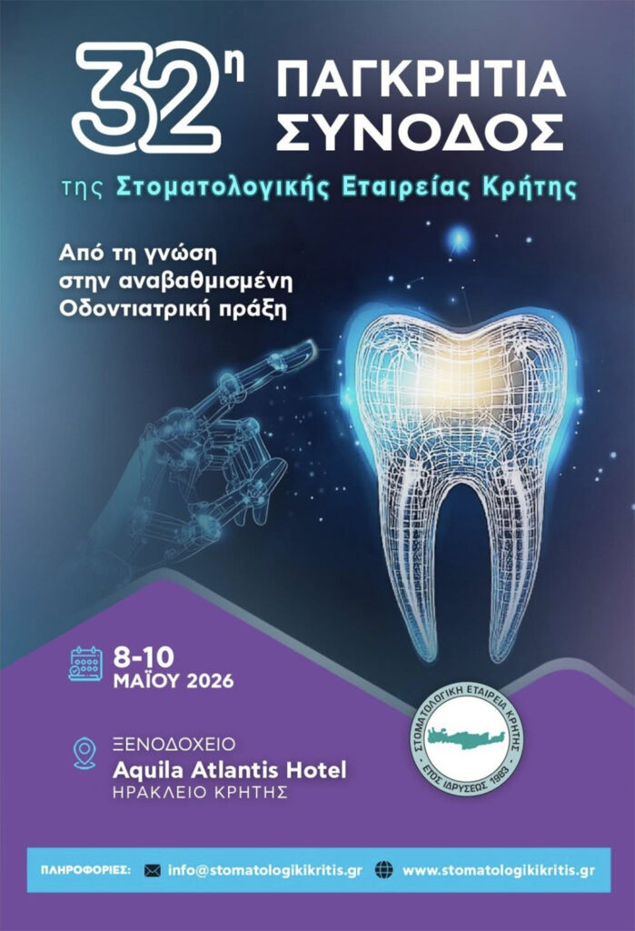 Η Στοματολογική Εταιρεία Κρήτης διοργανώνει την 32η Παγκρήτια Σύνοδο από 8–10 Μαΐου 2026 στο ξενοδοχείο Aquila Atlantis Hotel, στο Ηράκλειο, με επίσημους προσκεκλημένους ομιλητές τους κ.κ. Παπάζογλου Ευστράτιο, Τσούτη Κωνσταντίνο, […]